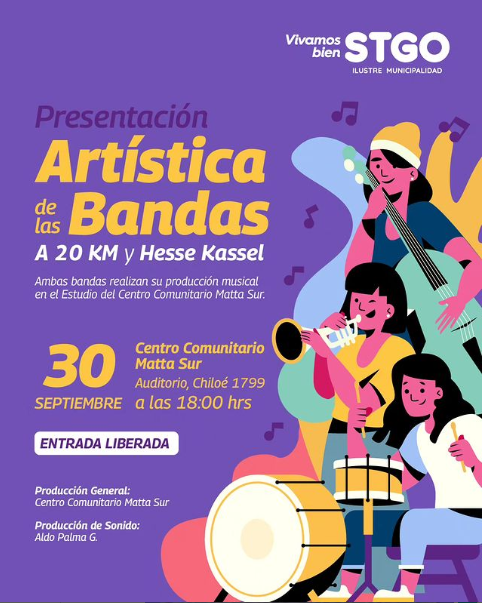 Ven a disfrutar del rock con las presentaciones artísticas de las bandas “A 20 km” y “Hesse Kassel” quienes realizan su producción musical en el estudio de grabación del Centro Comunitario Matta Sur y que desean compartir su música con la comunidad.