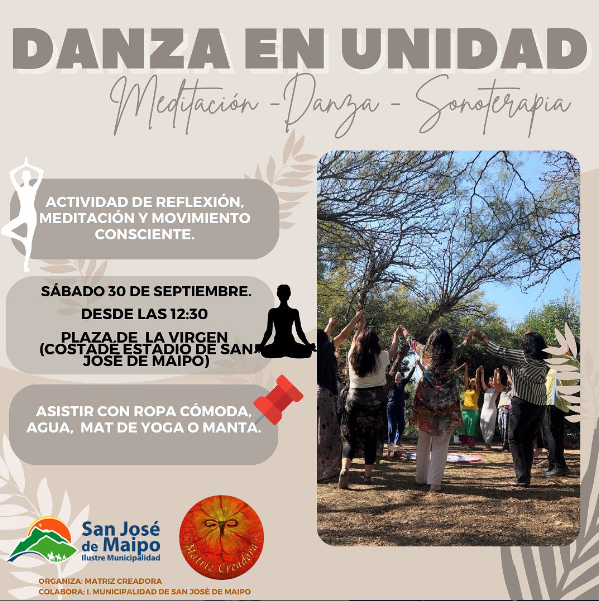 Este sábado 30 de Septiembre en la Plaza de La Virgen en San José de Maipo, desde las 12:30 horas. Matriz Creadora nos traerá un espacio de relajación, a través de la meditación, sonoterapia y danza consciente para hombres y mujeres. La actividad es gratis y sólo debes asistir con ropa cómoda, llevar una manta o mat de yoga y agua.