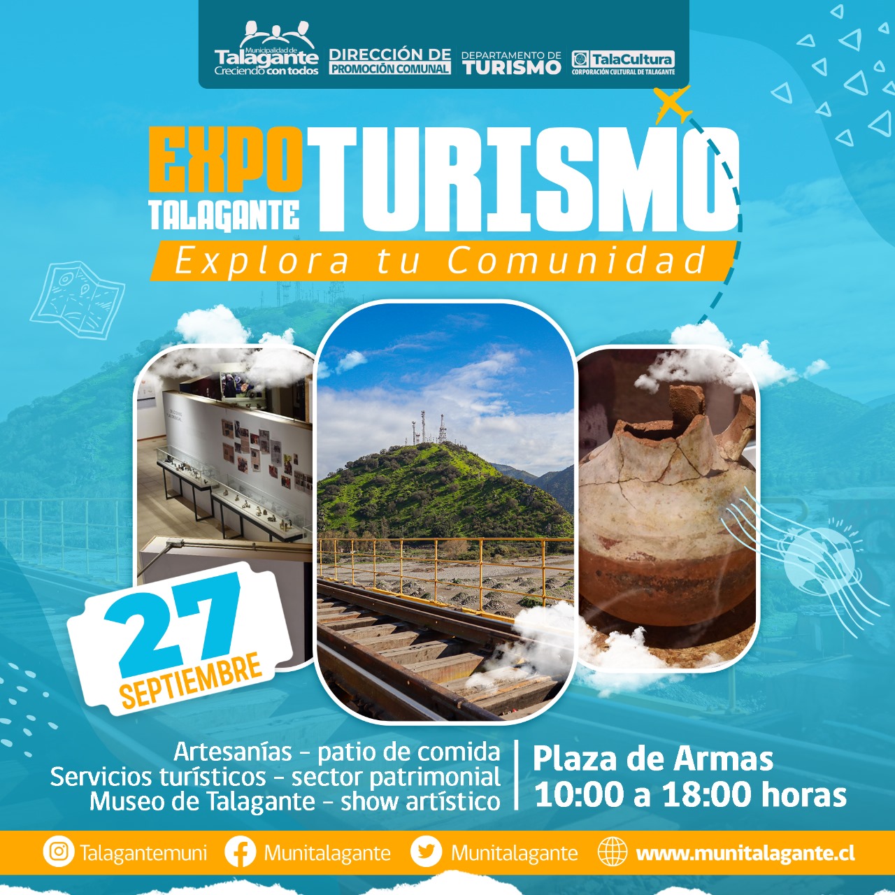 El próximo miércoles 27 de septiembre, Talagante celebrara las bondades de nuestro país. Su naturaleza, su desierto, sus campos de hielo, sus frondosos árboles centenarios, sus ríos, mar, cerros, cordillera y la tierra. Pero por sobre todo, celebramos a todas las personas que hacen de nuestro país, un país turístico y nuestra comuna quiere ser parte de esta conmemoración a través de una feria de emprendedores dedicados a esta área poco explorada en la comuna y organizada por el Departamento de Fomento Productivo.