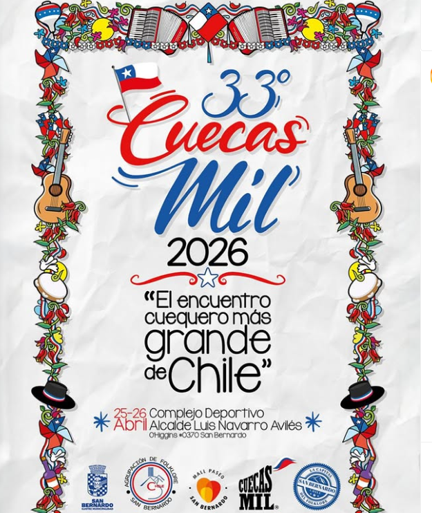 San Bernardo celebrará la 33° versión de Cuecas mil, el encuentro cuequero más grande de Chile, el que se llevará a cabo en el Complejo Deportivo Alcalde Luis Navarro Áviles, será escenario de música y baile, durante dos días.