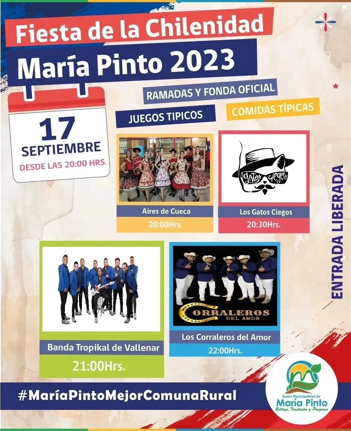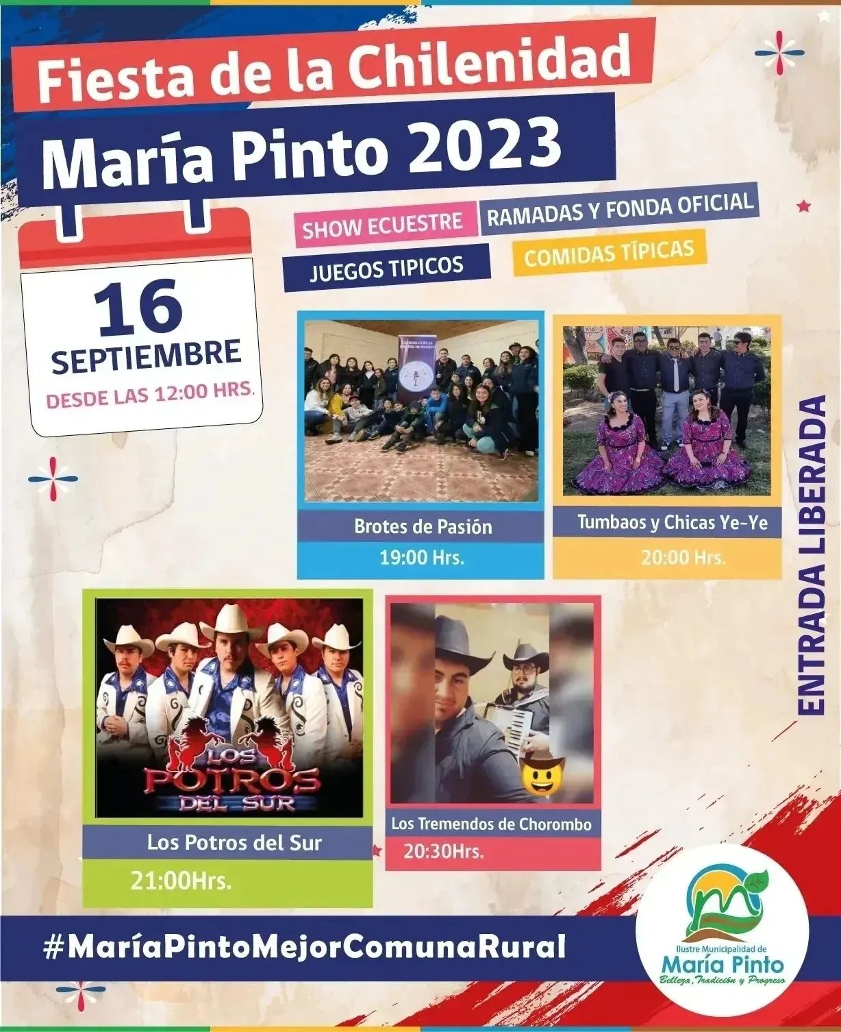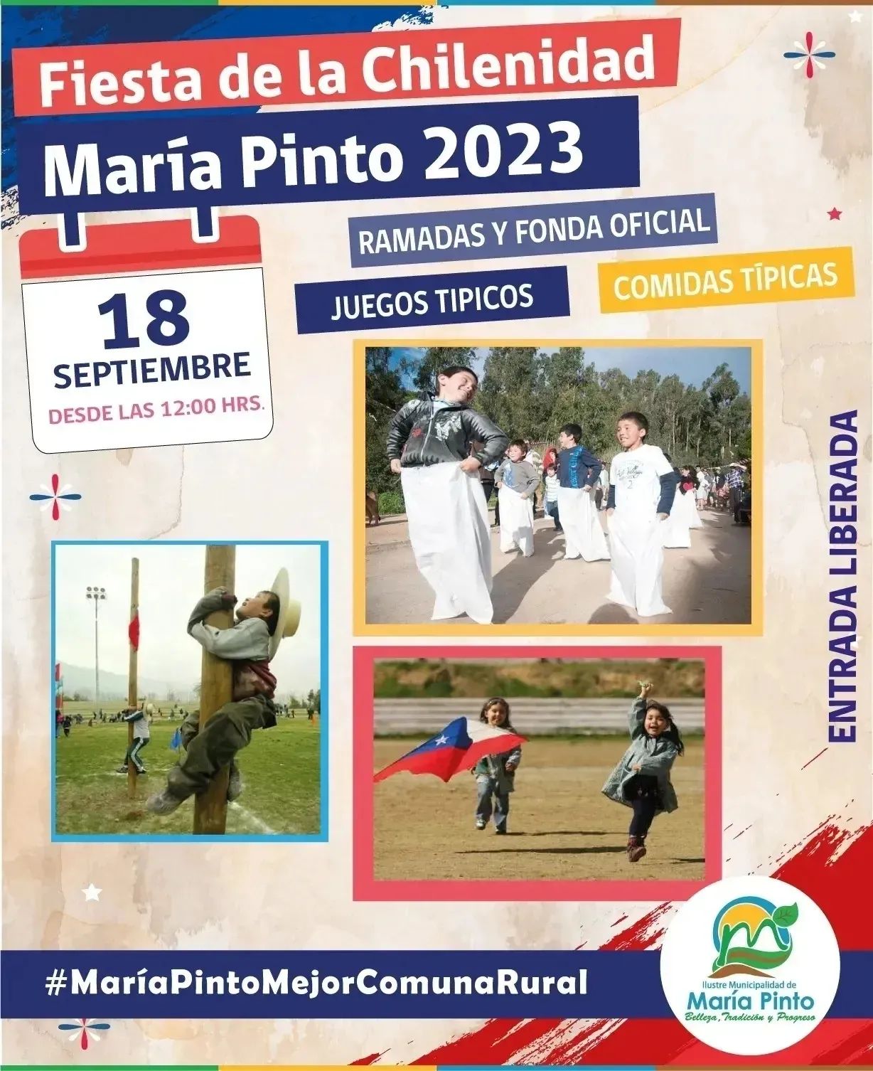 La Ilustre Municipalidad de María Pinto organizará la Actividad Comercial y Cultural ¨Fiesta de la Chilenidad María Pinto 2023¨ Ofreciendo a la comunidad de María Pinto y público en general, una actividad recreativa de carácter familiar que permita a los asistentes disfrutar de las tradiciones de nuestra tierra bajo una propuesta comercial y cultural.